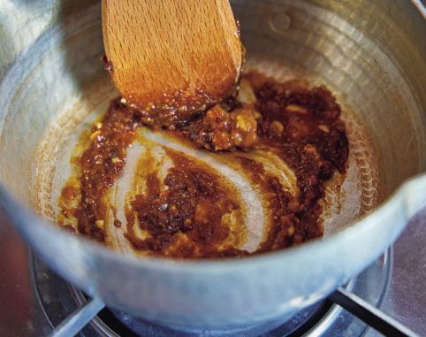 1.鍋に味噌を入れて弱火にかける。焦げないように木べらで練るように炒る。香ばしい香りが立ったらOK。油揚げを短冊切りにする。