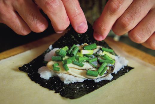 3.春巻きの皮を広げ、手前に海苔をのせる。里芋ペーストを塗り、牡蠣と細ねぎをのせて塩をひとつまみふる。端から巻いて、水溶き片栗粉でとめる。