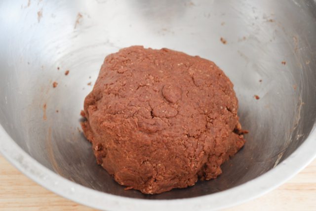 1.ボウルに卵、サラダ油、牛乳を入れ泡立て器で混ぜる。ホットケーキミックス、ココアパウダーを加えてゴムベラで切るように混ぜながら、生地をひとまとめにする。