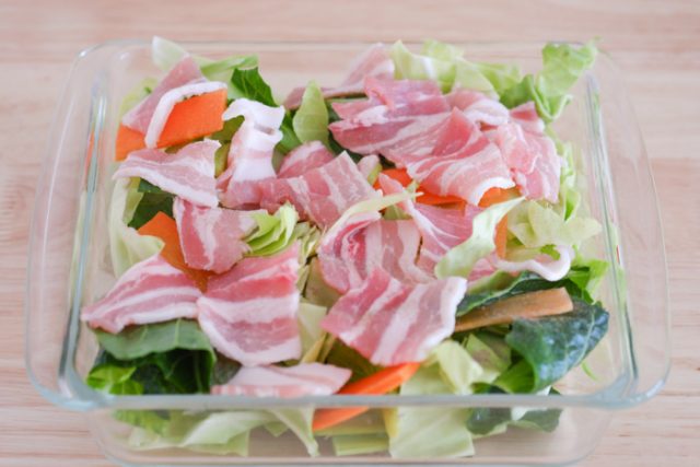 2.耐熱皿に野菜、豚バラ肉の順で広げて置く。