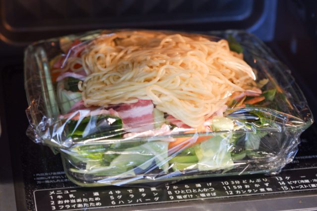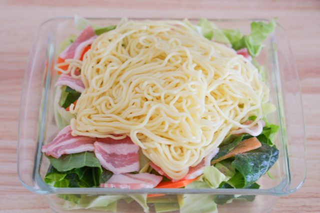 3.焼きそば麺をのせ、ふんわりラップをする。