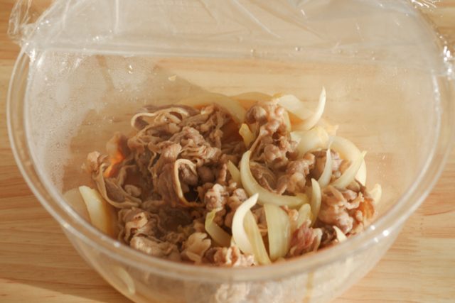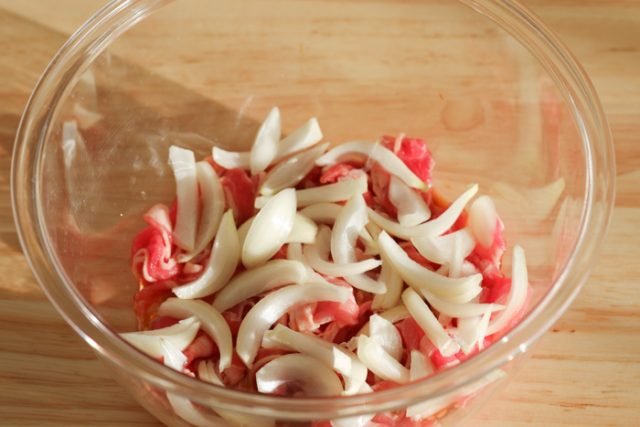 3.玉ねぎは薄切りにして、1の牛肉の上にのせる。ふんわりラップをして、600Wの電子レンジで2分加熱する。