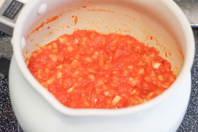 市販のトマトソースは塩気も強いため、少し手間ですがこのレシピを作る際はカットトマト缶から塩分控えめのトマトソースを作り、餃子やチーズの塩気と合わせることで、健康にもやさしく、おいしく食べられます。