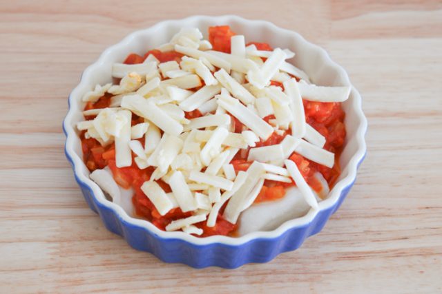 3.耐熱皿に冷凍餃子を重ならないよう並べ、2のトマトソースをかける。ピザチーズをのせ、オーブントースターで10分ほど焼く。