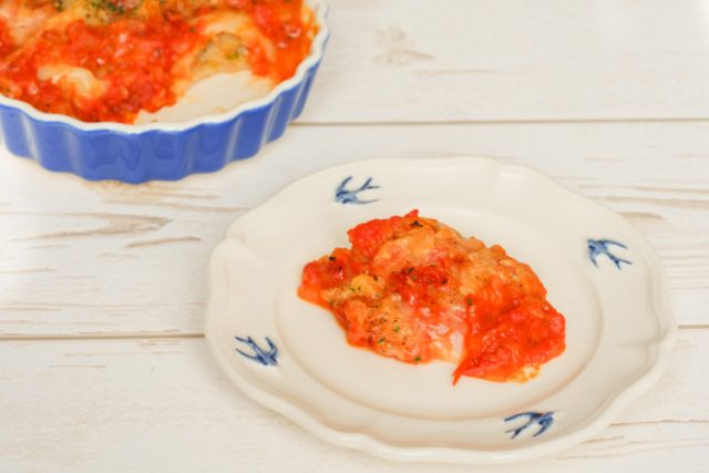 モチモチの皮と中のひき肉、トマトソースとチーズでラザニア風になります。