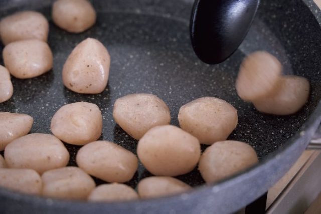 炒めているこんにゃくが「きゅる~ッ」と鳴いたら、だしを入れるサインです!