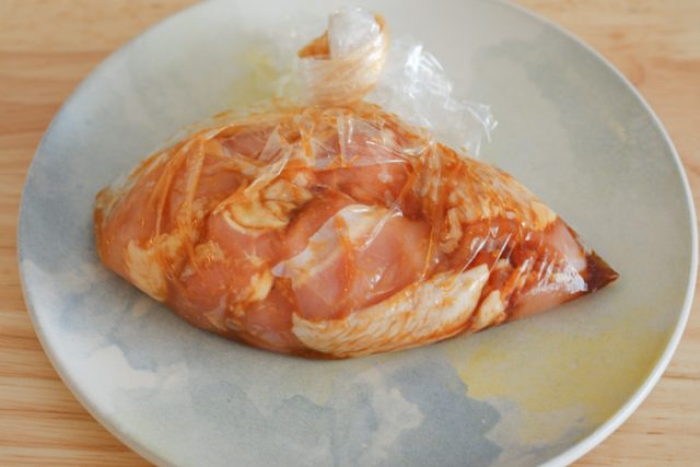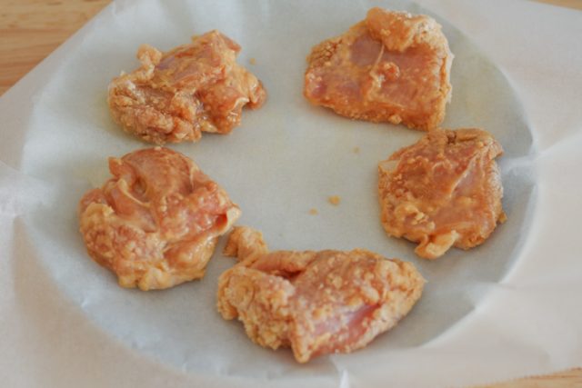 3.電子レンジ対応のお皿の上にクッキングシートを敷き、2の鶏肉をくっつかないように、皮を下にして並べる。ラップをしないで、600Wの電子レンジで6分加熱する。