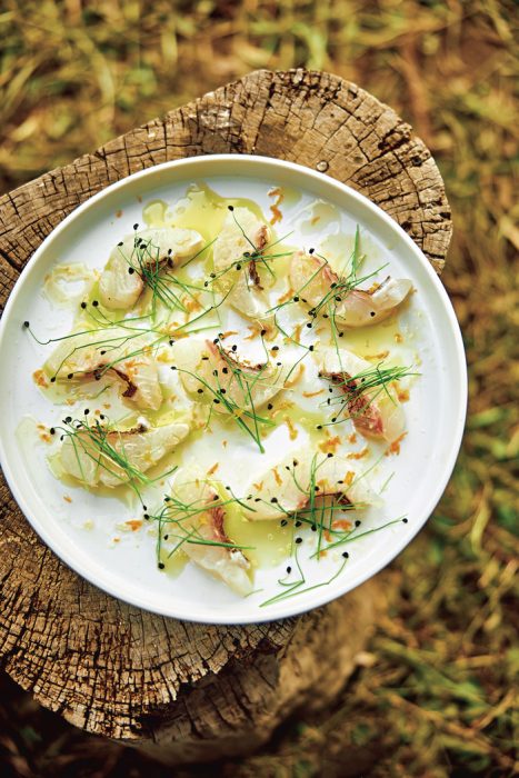 皮目を軽く炙ることで、香ばしく、なおかつ食べやすくした鯛のカルパッチョ。オレンジのほんのりした甘さと、オイルの苦みが好相性です。