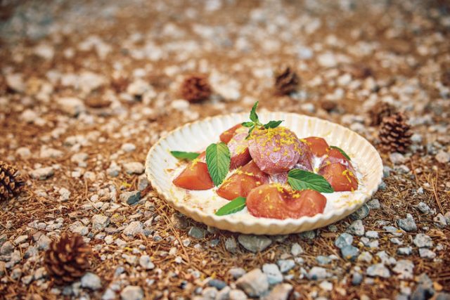 - 水分がなくなったら完成。バニラアイスをソース代わりに添え、ミントの葉と、オレンジの皮をすり下ろして散らす。