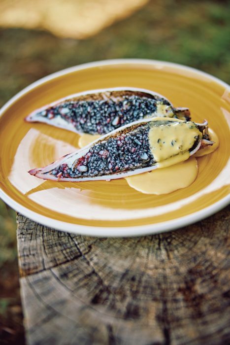北海道の郷土料理“いかめし”を洋風にアレンジ。粘りが少なく、軽い食感のカリフォルニア米で作ったが、米ともち米を半量ずつ使ってもいい。