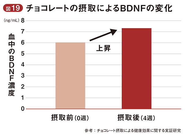 脳については、チョコレートの摂取(4週間後) で、脳にとっての重要な栄養分「BDNF(脳由来神経栄養因子)」の血中濃度が上昇することが報告されています(図19参照)。