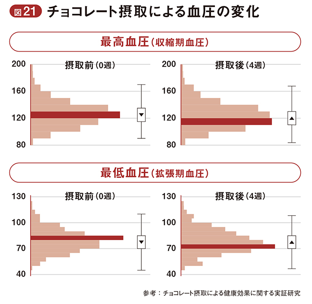 下のグラフ(図21)は、被験者全員について、チョコレート摂取前と摂取後(4週間後)の最高血圧(収縮期血圧)と、最低血圧(拡張期血圧)の変化を比較したものです。