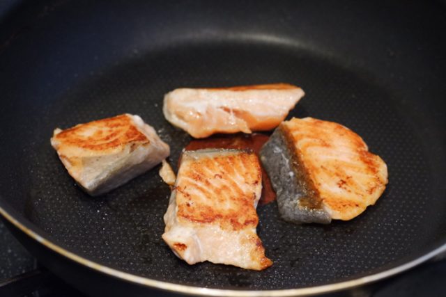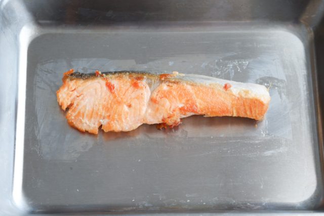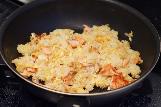 鮭は焼いた後に炒めるので、表面に焼き目がつけば、しっかり中まで火が通っていなくても大丈夫です。