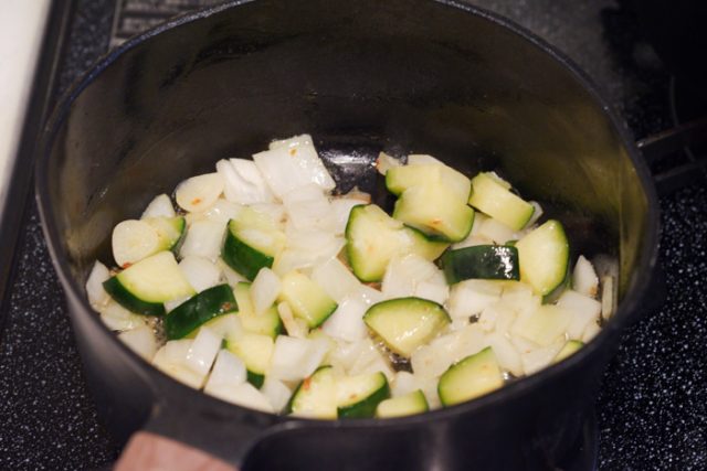 1.玉ねぎ、ズッキーニはそれぞれ1cm角に切る。