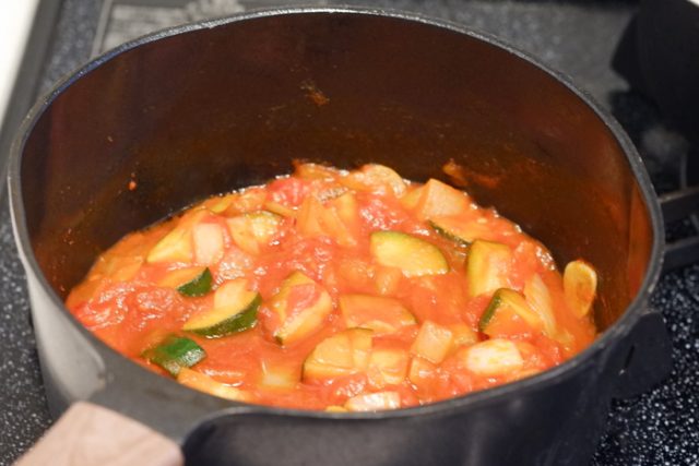 4.野菜がしんなりしたらカットトマト缶、顆粒コンソメを入れて弱中火で5分ほど煮る。