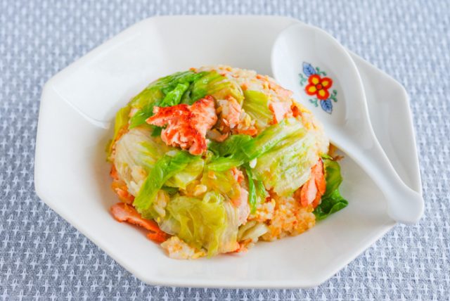 4.2の鮭を入れ、鶏がらスープの素、胡椒を加え、鮭をほぐしながら炒める。