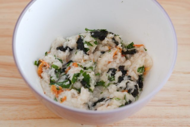 2.すりおろしたれんこんと焼きのり、★の材料をボウルに入れ、混ぜ合わせる。