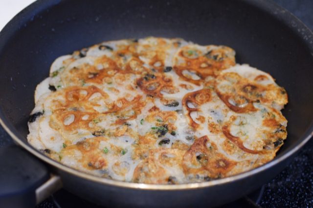 3.フライパンにごま油を熱し、薄切りにしたれんこんを半量フライパンに広げる。その上に2の生地を流し、残りのれんこんを並べる。中火で焼き色がつくまで焼いたらひっくり返し、もう片面も焼く。