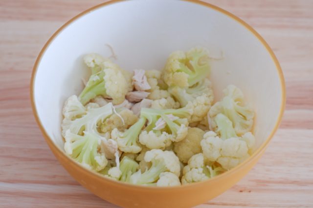 2.耐熱容器に鶏ささみ、カリフラワーの順で入れ、酒を回しかける。ふんわりラップをして、600Wの電子レンジで3分半加熱する。水気を切り、鶏ささみをほぐす。