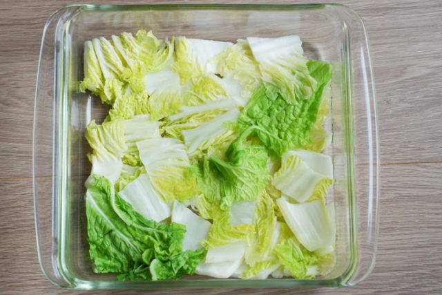 1.白菜は一口大の角切りにして、耐熱容器に平らに並べる。ふんわりラップをして600Wの電子レンジで3分加熱する。