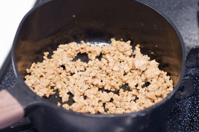 2.フライパンにごま油を熱し、豚ひき肉、おろしにんにく、生姜を炒める。