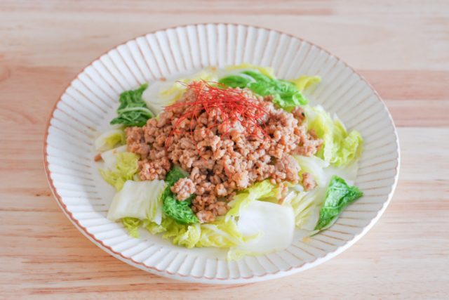 電子レンジで蒸した白菜は甘さが際立ち、甘辛く味付けした豚ひき肉とよく合います。