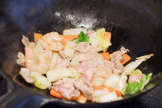 3.鍋にサラダ油を熱し、白菜の芯の部分と豚こま肉、えび、人参を炒める。