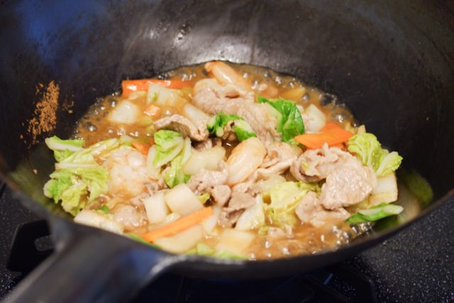 4.人参が柔らかくなったら白菜の葉の部分を加えて数分炒め、2を加える。