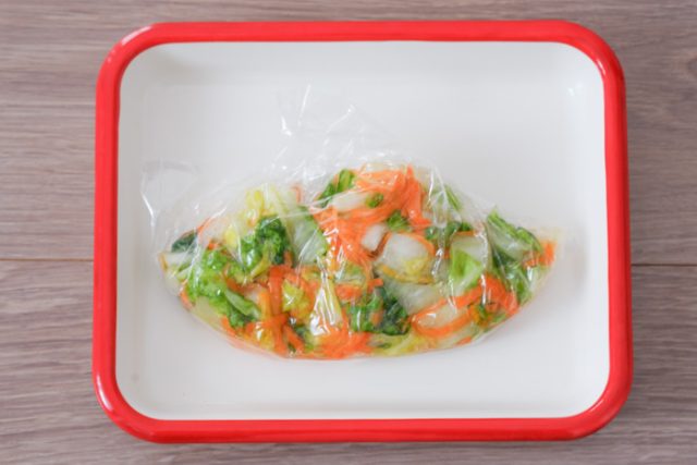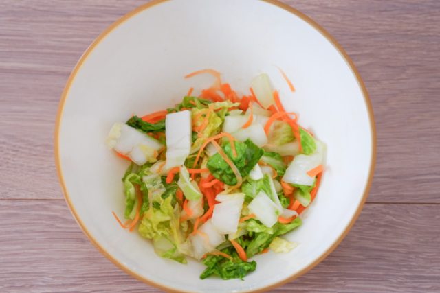 2.ボウルに白菜、人参を入れ、塩を振って揉み込み、15分置く。出てきた水分をしっかり絞る。