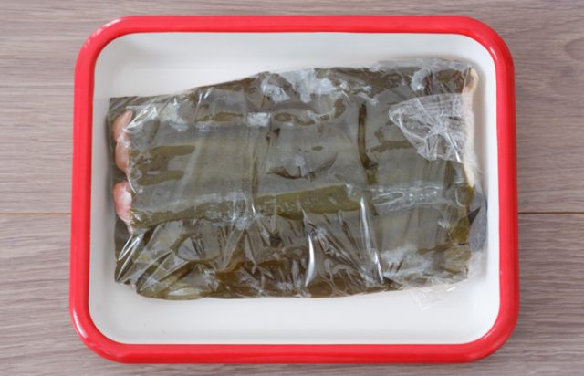 1.昆布は酒を含ませたふきんで表面を軽くふき、鶏もも肉を挟む。きつくラップで巻き、冷蔵庫で半日以上置く。