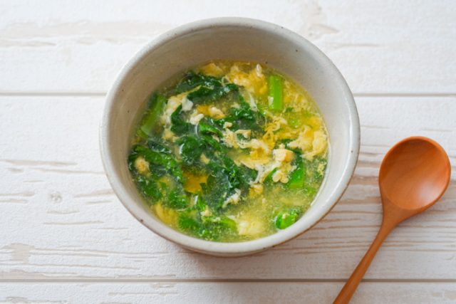 寒い日にぴったり、生姜入りの菜の花と卵の中華風スープです。