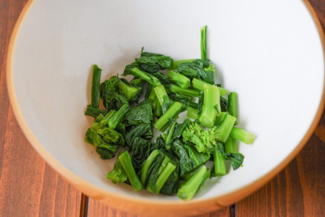 1.菜の花はキッチンばさみで2cmの長さに切り、耐熱容器に入れふんわりラップをし、600Wの電子レンジで1分加熱する。