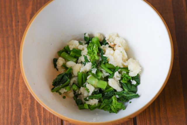 2.じゃがいもは皮つきのままよく洗い、ラップに包んで600Wの電子レンジで2分、裏返して同様に2分加熱する。3.2のじゃがいもを入れて熱いうちに皮を取り除きながらつぶして、水気を切った1の菜の花を加える。
