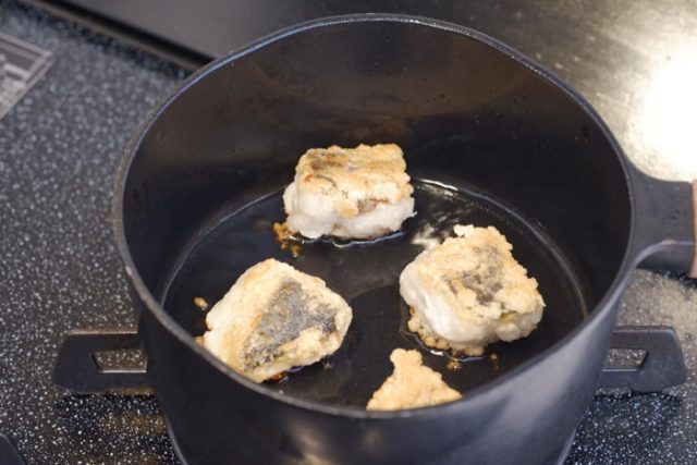 鰆は柔らかい身が特徴なので、多めの片栗粉で揚げることで、外はザクザク、中はふわっとした食感が楽しめます。