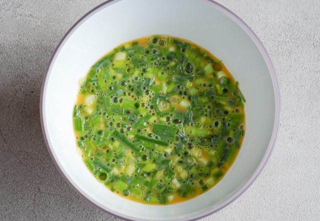 2.ボウルに卵を割りほぐし、水、白だし、1の青ねぎを加え混ぜ合わせる。