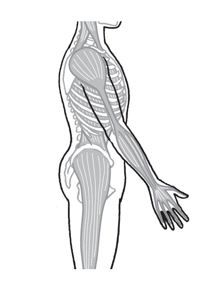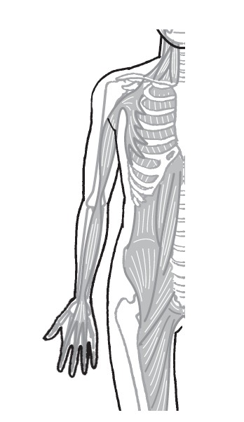 手の甲から腕の外側(前ならえの姿勢で外側)につながっている体の横を通るライン(サイドライン)。特に、パソコンなどで作業をする人は、ここのライン上で癒着することが多い。