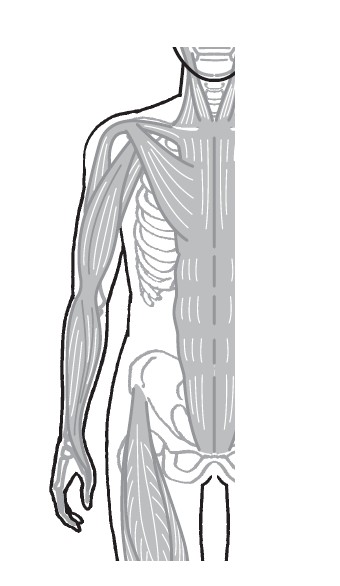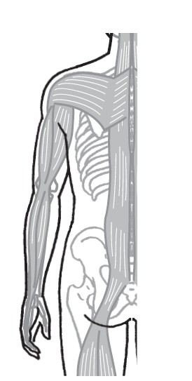 手のひらから肩の前側につながる体の奥側を通るライン(ディープコアライン)。重い荷物を持つことが多い人、タクシーやトラックのドライバーなど、長時間運転している方々は、このタイプが多い。