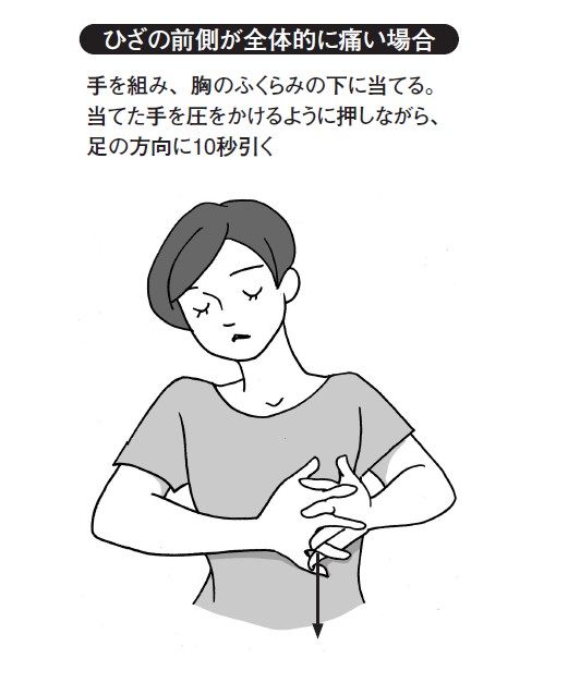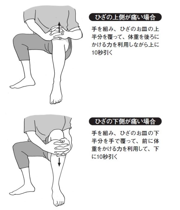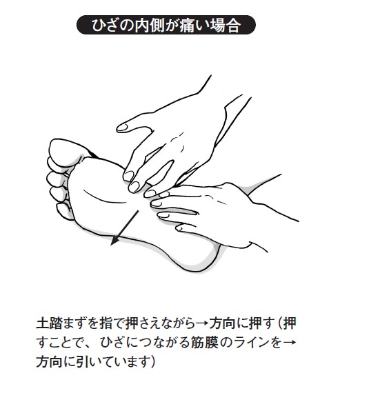 自分で、ひざのどの部分に痛みを感じるのかがはっきりわかる方は、どれかピンポイントにやっていただいても構いませんが、痛みが鋭い場合、なかなか自分では痛みの場所を判断できない場合が多いので、できれば予防も兼ねて痛みのない側もやっておくほうがよいでしょう。