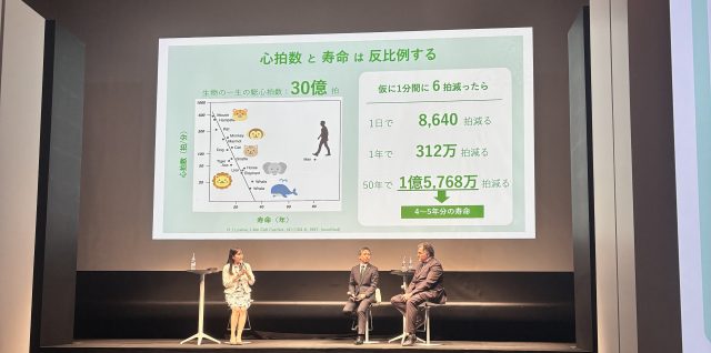 心拍数が少ない生物は長生きの傾向にある。例えば、心拍が1分間に6拍減ると、1年で312万拍減り、50年で1億5768万拍減る。これは、4~5年分の寿命に相当するというから驚く。