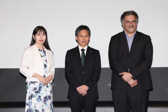 「大塚製薬ケンフェロール研究説明会」登壇者たち。(写真左から)ファシリテーターを務めた、TAZ Inc.社長・ジーンクエスト取締役ファウンダーであり、生命科学者・高橋祥子さん。大塚製薬先端科学研究所の池田泰隆所長。ピッツバーグ大学外科学教授/計算システム生物学教授/宇宙生体医科学センターのAfshin Beheshti(アフシン・ベヘシュティ)所長。