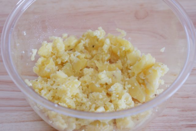 1.じゃがいもは皮つきのままよく洗い、耐熱容器に入れ、ふんわりラップをして600Wの電子レンジで3分加熱する。裏返して同様に2分加熱し、熱いうちにフォークでつぶしながら皮を取り除く。