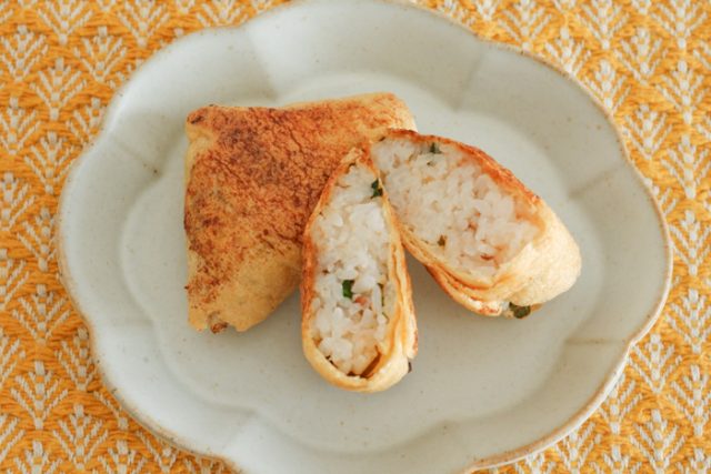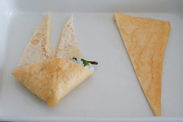 2.油揚げは三角に切り袋を開き、切れ目を入れる。それぞれ1のごはんを詰め、三角の形になるよう成型する。
