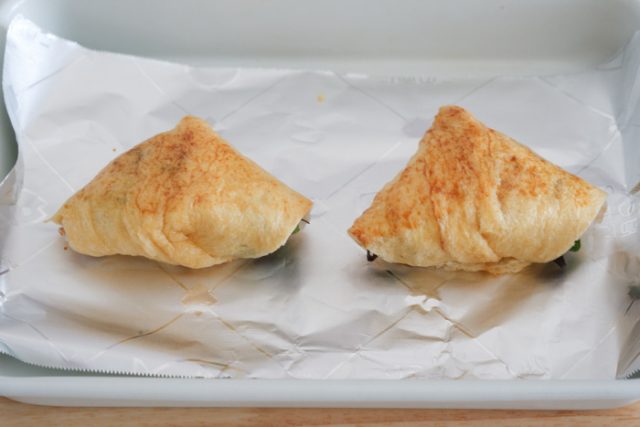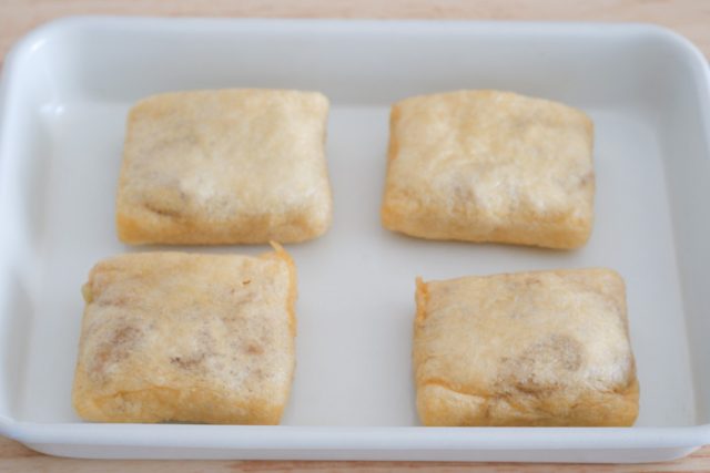 4.油揚げは半分に切り、袋を開いてそれぞれ3を詰める。口を折り返し、サラダ油を熱したフライパンで返しながら両面揚げ焼きにする。
