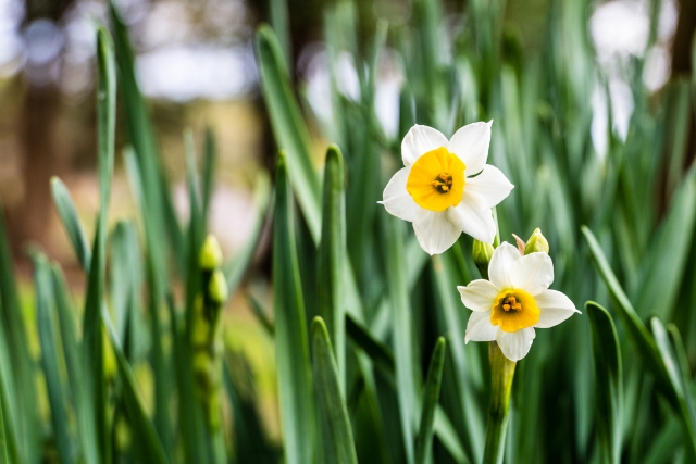 凛とした白い花を咲かせる水仙は、冬の終わりに香り高く清らかな姿を見せる、春を待つ花の一つです。地中海沿岸を原産とし、シルクロードを経て日本へ伝来。越前海岸や淡路島、伊豆半島の爪木崎(つめきざき)などに群生地があり、寒さの中でも可憐に咲く姿は、多くの人に親しまれています。