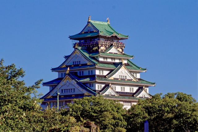 勝家が妻の市と共に自害すると、敵対勢力の制圧に成功した秀吉は、商品流通や水陸交通で栄えた大坂の地に大坂城を築城し、拠点とします。