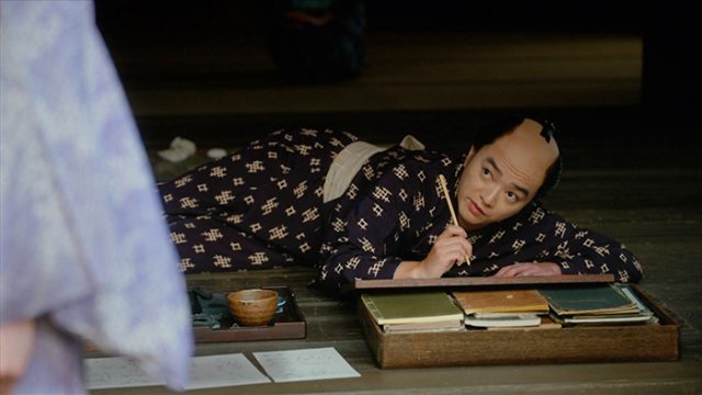 I:江戸から下野の豪商のもとに転じた喜多川歌麿(演・染谷将太)は、釜屋伊兵衛(演・益子卓郎)の口利きでどんどん肉筆画の仕事が入ってきていました。歌麿が描いた襖絵の前に金持ちたちが集まって、綺麗どころも呼ばれ、歌麿の絵を鑑賞している場面が描かれました。歌麿も綺麗な身なりで、先生然としている様子が印象的でした。