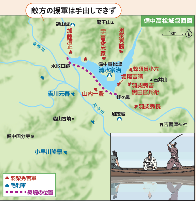 秀吉の思惑通り、突貫工事でつくられた堤防は見事に川の水をせき止め、低湿地の城を“浮城”に変えてしまった。援軍にやってきた小早川隆景や吉川元春などの毛利勢も呆然と眺めるしかなかった。