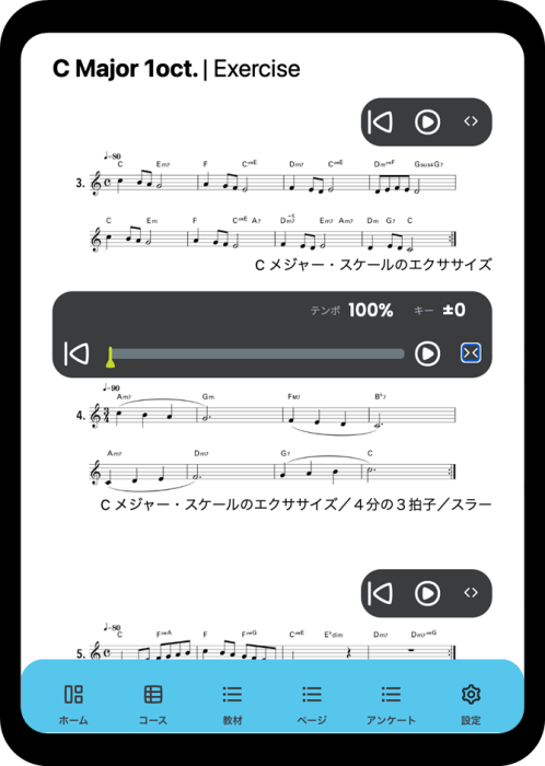 ヤマハミュージックスクールに入会すると利用できる、デジタル教材視聴サイトLMS「ミューナビ」。というサービスもある。動画コンテンツや音源、デジタル楽譜などのデジタル教材を、自分のPC、スマホ、タブレットで見ることができる。テンポを変えられるので、練習しはじめにも便利。移動時間の車中や入浴時間など、隙間時間を活用して試してみたい。*利用料はレッスン料に含まれる。