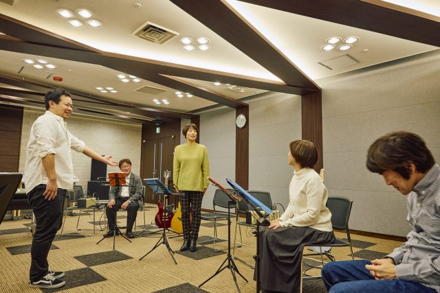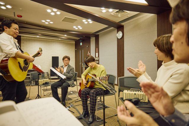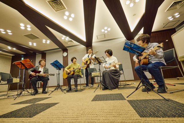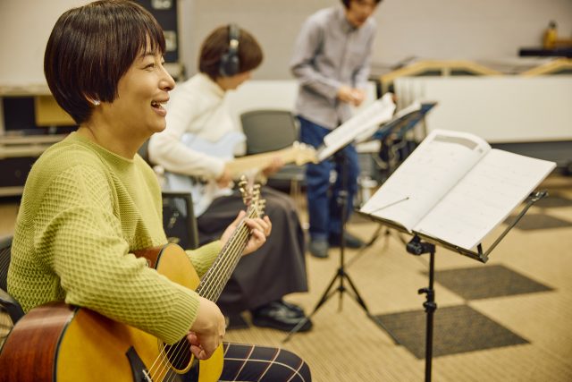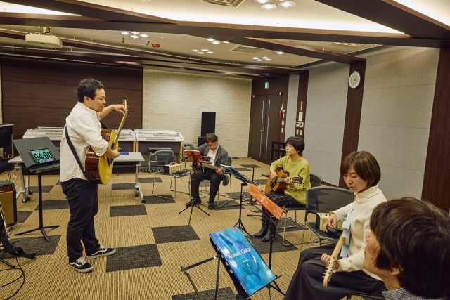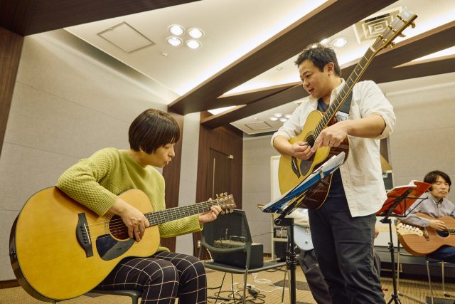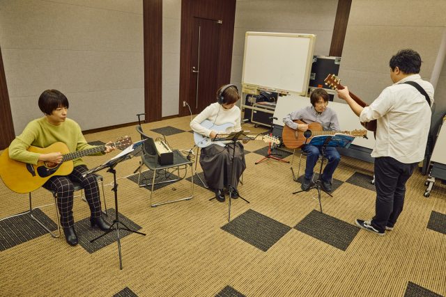 レッスンの最初はベーシックエクササイズから。ここではメンバー全員で、ウォーミングアップのための基礎練習を一緒に行なう。町田は触れること自体はじめてだったので、アコースティックギターの持ち方から弦の弾き方まで丁寧に教わった。