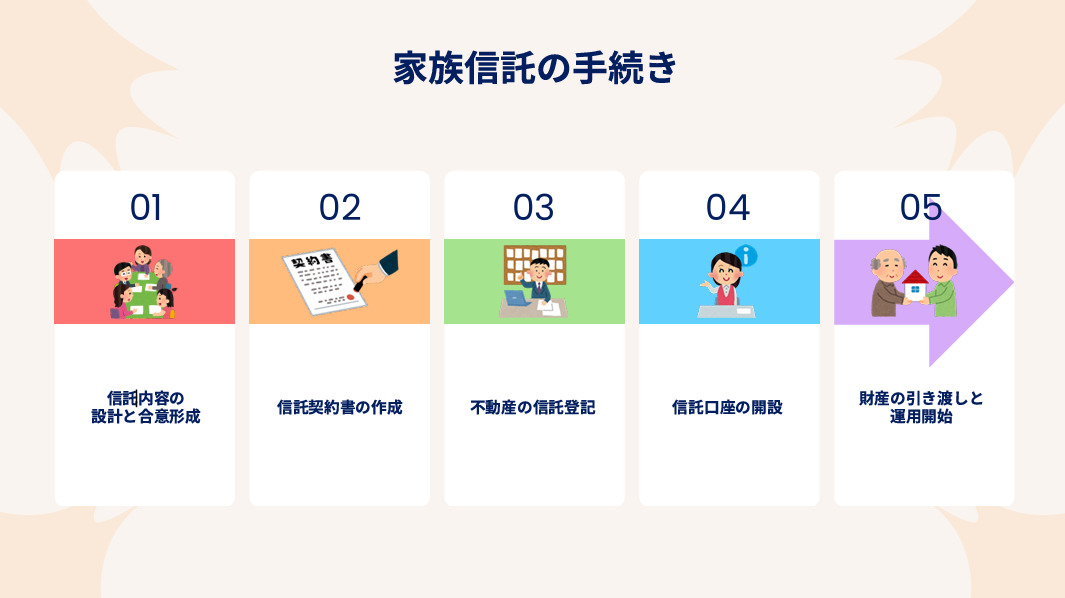 家族信託の手続きは、大きく分けて5つのステップで進みます。